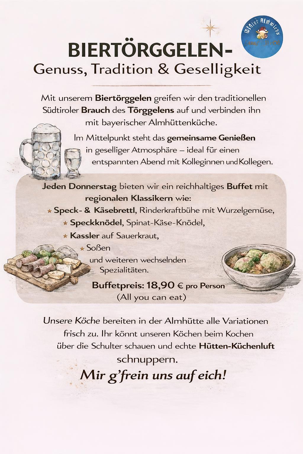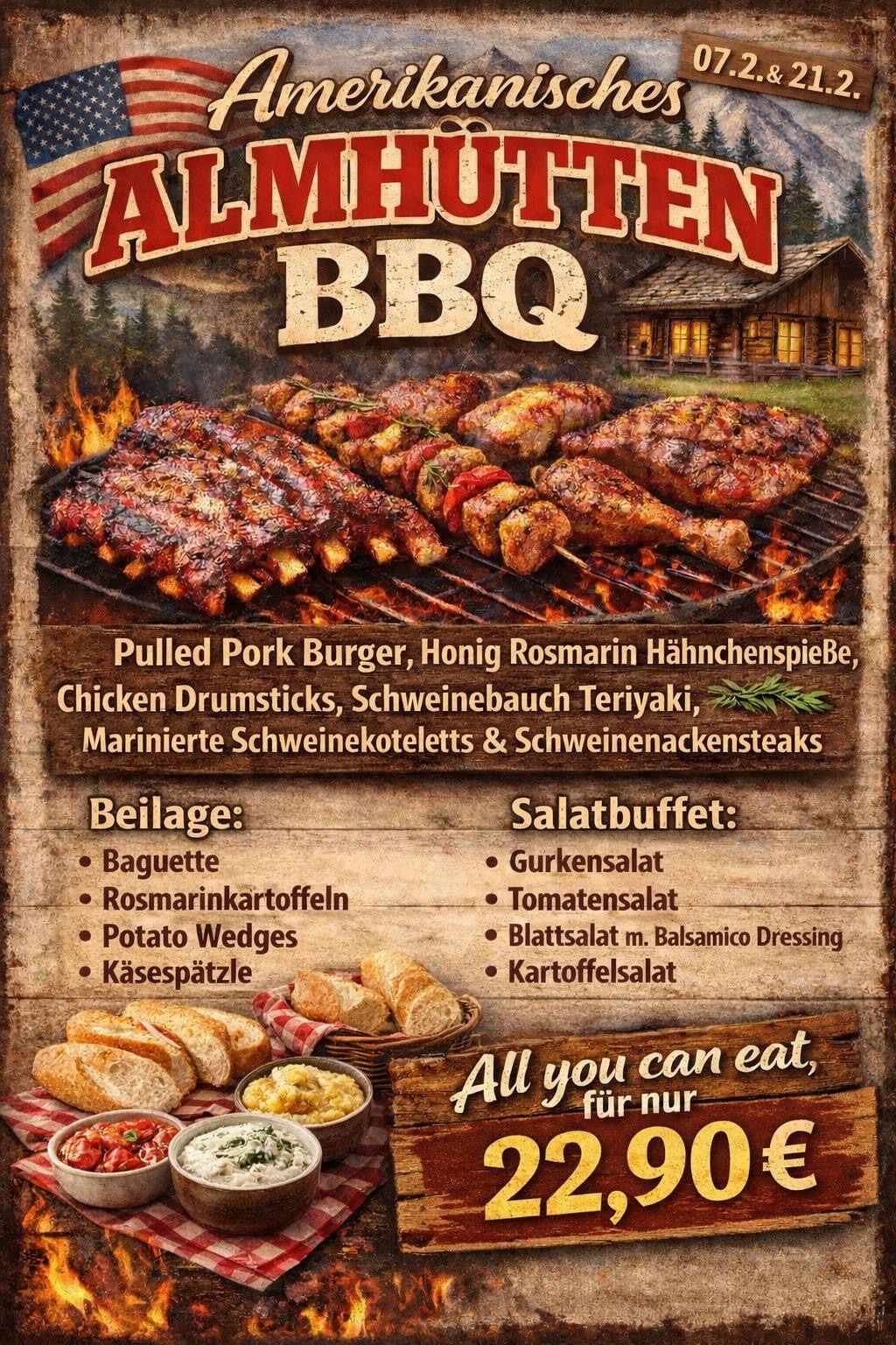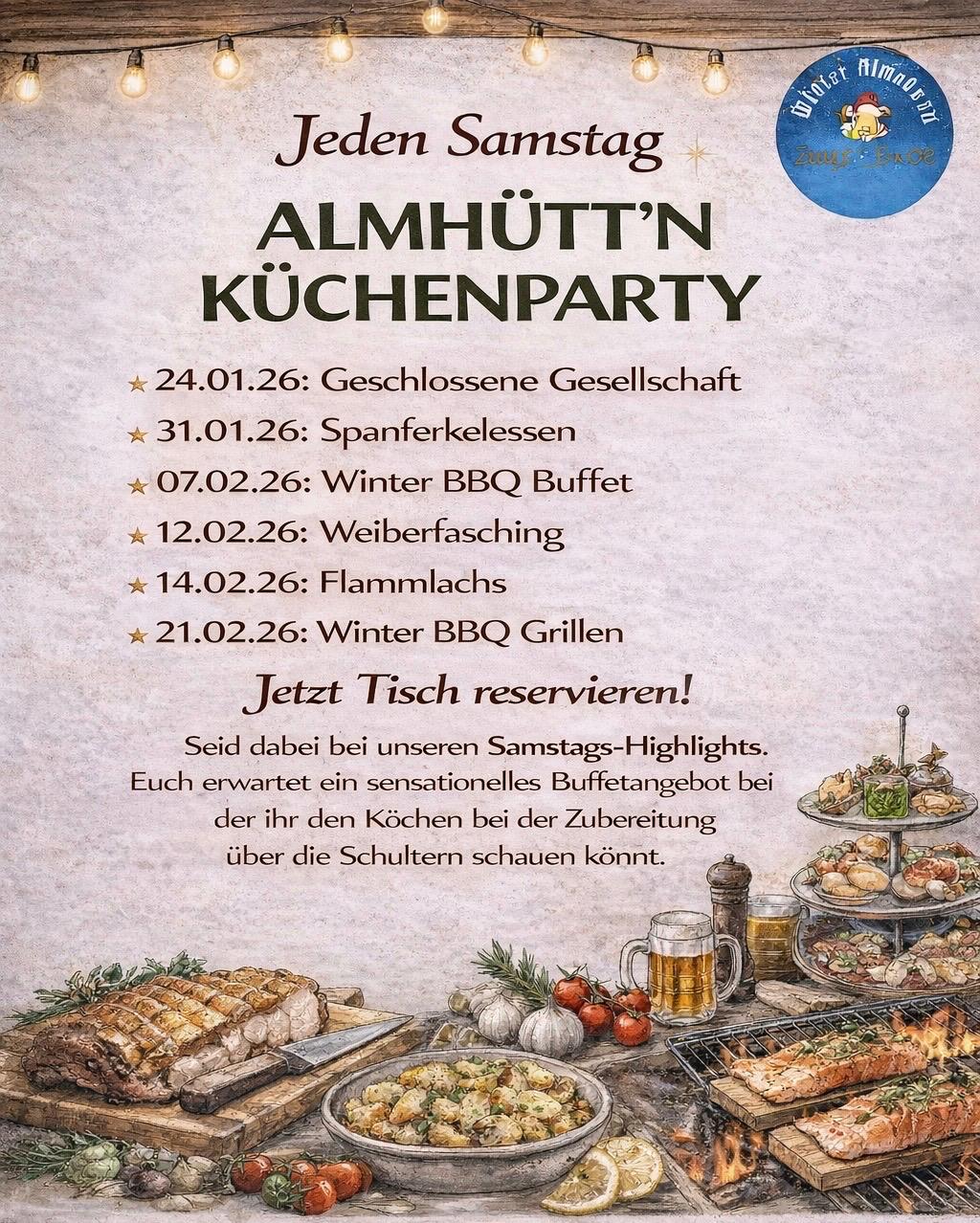 In den Monaten Januar & Februar erwartet euch in unserer Almhüttn ein  abwechslungsreiches Buffetangebot (All you can eat) Ihr könnt unseren Köchen über die Schulter schauen und echte Hütten – Küchenluft schnuppern.  Im Mittelpunkt steht das gemeinsame Genießen in gemütlicher Hüttenatmmosphäre.