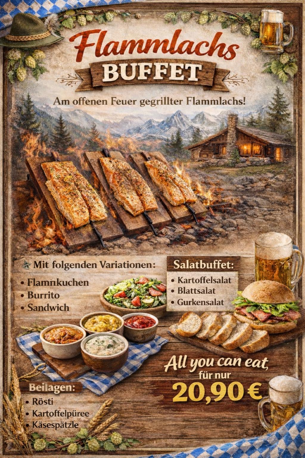 14.02.26: Flammlachs – Buffet 20,90€ p.P. – all you can eat. (Flammlachs vom Grill, Salatbuffet, Burrito, Flammkuchen, Kartoffelrösti, Kartoffelpüree, verschiedene Dips uvm.)